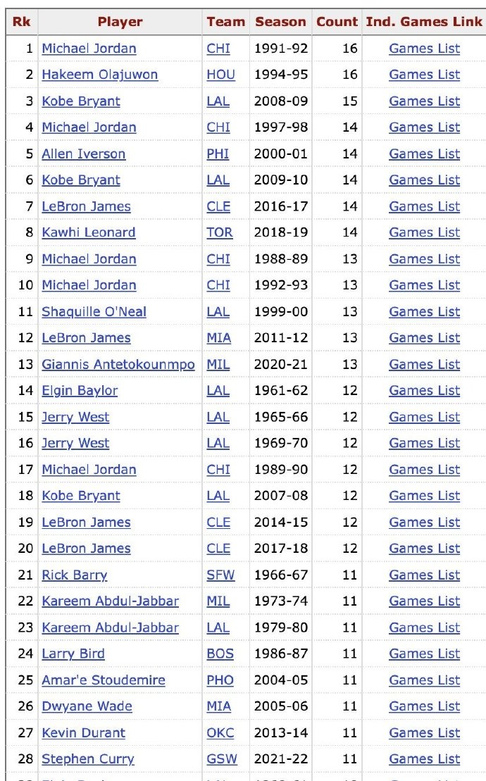 “SGA上半场卸下了一些球权,全场还是稳定输出34分8助攻,这是他今年季后赛第13次单场30+,历史上单个季后赛30+场次更多的见下图。而且SGA已经连续9场季后赛主场30+,平张伯伦的历史纪录。