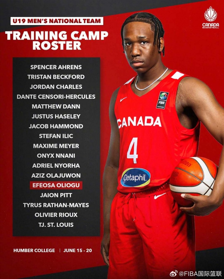 世界杯首战中国队!加拿大U19男篮训练营名单:奥拉朱旺之子领衔