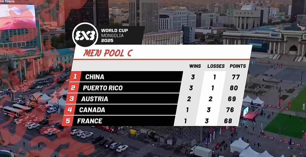 注:3V3排名规则先看胜场,再看交手战绩,再看总分,本场比赛法国只要赢球,同组波多黎各3胜1负排名第一,中国法国奥地利三队战绩相同都为2胜2负,奥地利和法国均赢了中国,中国由于交手劣势,无论如何都会排在小组第四遭到淘汰。法国和奥地利则是会携手进入附加赛。