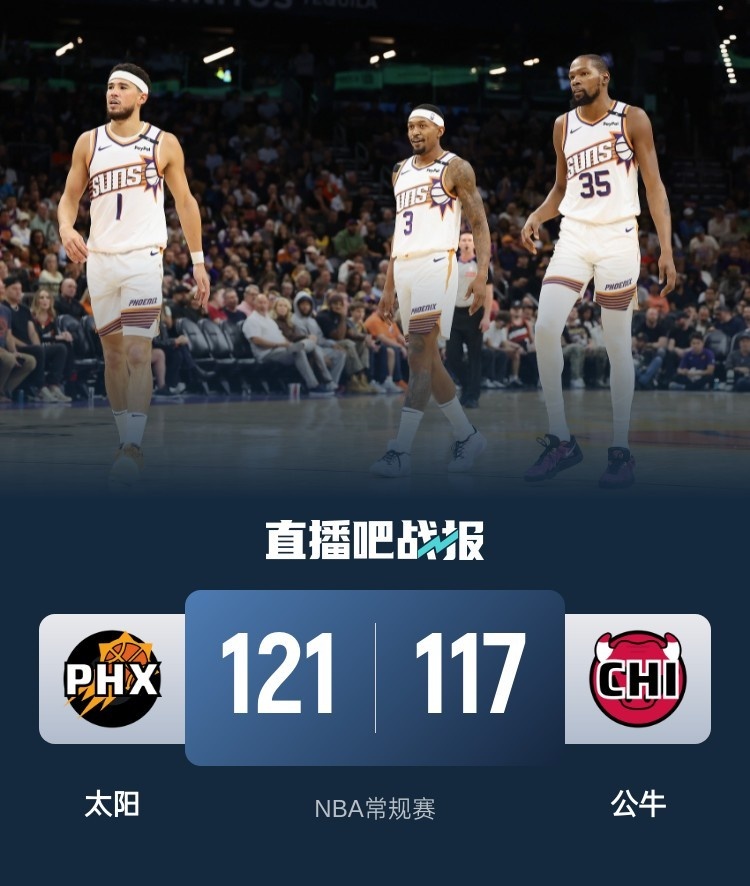 比赛开始,太阳很慢热打了3分多钟才通过罚球拿到首分,半节多得分还未上双,公牛9-2开局后接连三分建立主动权,首节领先10分,次节双方展开拉锯战,公牛全民皆兵保持领先,但太阳三巨头轮番发力,助队单节轰出40分半场反超2分。下半场,布克继续发力里突外投单节轰下14分,比尔也接连突破取分领先到双位数,但公牛接连3记三分三节还是追到差3分,末节太阳上来7-0再次领先双位数,但公牛外线发炮还能咬住比分,怀特2+1直接追平,杜兰特接连罚球,布克三分再进,布克接连不讲理三分杀死比赛,最终太阳121-117力克公牛,终止4连败同时送对手6连败。