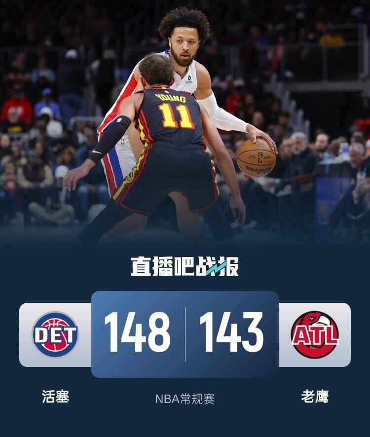 比赛上来,两队就打得十分胶着,场上比分交替领先,到了次节双方的攻势更盛,单节轰出了43-38的高比分,本节末段老鹰稍稍落入下风,半场结束时活塞领先8分;下半场回来,两队依旧是不防守,连续三个单节六节次全部得分30+,不过活塞始终占据着场上的主动权,末节康宁汉姆再中三分,分差也是首次达到了两位数,末节老鹰发起反扑并成功实现反超,关键时刻施罗德打进2+1,特雷-杨抛投不中,比斯利两罚全中没给对手机会,特雷-杨最后时刻想砸筐抢板可惜违例,最终活塞险胜老鹰迎来六连胜。