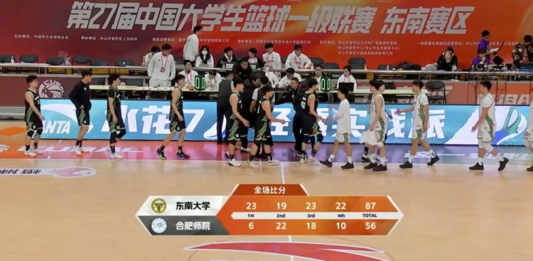 末节比赛,合肥师范学院没有再打出反扑的势头,进攻端再次陷入到困境,8分钟的时间仅拿到4分,东南大学趁势将领先优势扩大到三十分以上,比赛也是早早就失去了悬念,最终东南大学87-56大胜合肥师范学院,迎来连胜的同时也送给后者三连败。