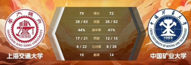 末节决战,艾渝内线先中一球,两队各自造成杀伤通过罚球拿分,比分交替领先,顿家威上篮打中帮助上海交大获得4分优势打停对手,暂停回来吴泽昊连投带罚拿到4分,李昕哲内线三连击顽强咬住,双方争夺陷入白热化,陈天灿妙传刘冠男上篮得手,李昕哲累计5犯,上海交大反击拿分继续扩大优势,顿家威三分穿针,中国矿大无力回天。最终,上海交大79-72力克中国矿大。