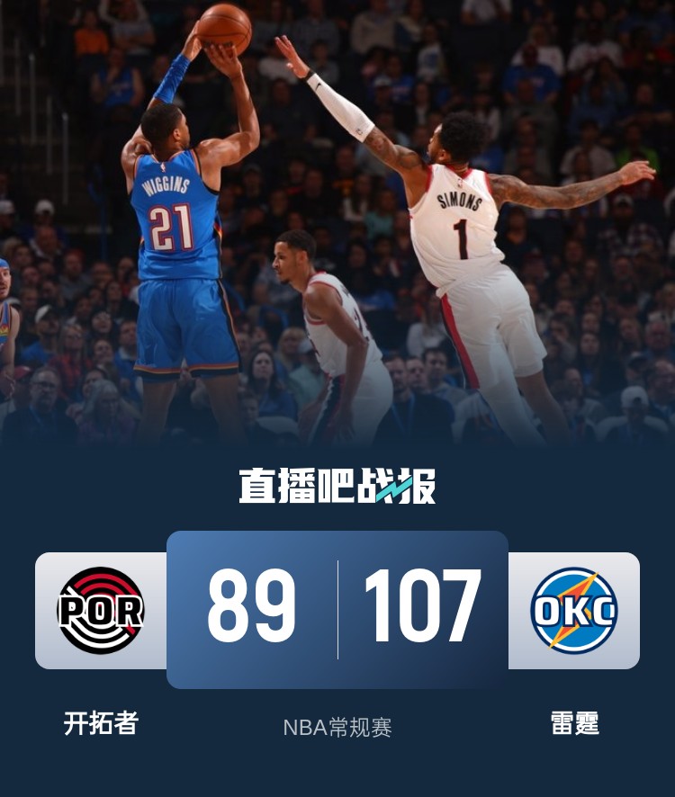 开场后雷霆外线手感不错频频命中三分,在第一节中段他们打出攻势取得领先,随后开拓者也用三分回击缩小分差。第二节上来西蒙斯率先发力带领开拓者反超比分,雷霆通过加强防守多次造成开拓者失误打出反击,并且外线续上火力重新夺回领先,第二节尾声开拓者陷入得分荒,半场过后雷霆领先到18分。易边再战,雷霆上来延续攻势将分差拉大到20分开外,亨德森突然爆发带领开拓者一路追到只差5分。第四节雷霆及时稳住局面,两队围绕10分拉锯,开拓始终无法追上比分,最终雷霆107-89击败开拓者取得6连胜,开拓者遭遇2连败。