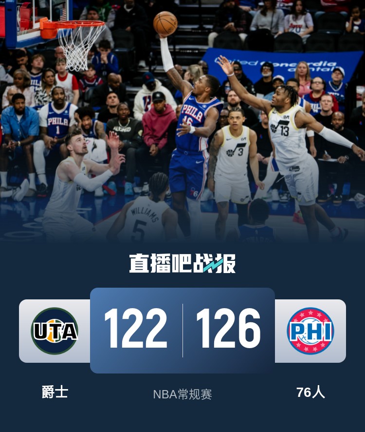 上半场,爵士率先发力,菲利波夫斯基内外开花独得12分帮助球队一度取得16分优势,此后76人奋力反击回敬13-0的攻击波迅速迫近比分,次节道丁上篮完成反超,76人连中三分扩大优势,爵士多点开花给出回应,半场战罢76人65-58领先爵士。下半场,76人延续火力,沃克单节16分帮助球队不断扩大优势,末节76人一度获得20分以上领先,但爵士轰进5记三分迅速迫近比分,关键时刻76人稳扎稳打保持优势,爵士一度追到2分,沃克两罚全中,最终,76人126-122力克爵士,主场过关。