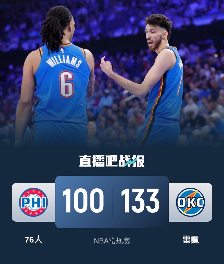 首节开打后雷霆早早发力轰出10-0开局,格莱姆斯联手奥基基短暂止血,但雷霆多点开花牢牢占优,首节结束时雷霆已经领先16分,次节回来,雷霆进攻火力稍稍放缓,格莱姆斯连投带罚继续取分,但76人无法打出追分高潮,半场战罢,雷霆依然领先14分。易边再战后雷霆找回节奏不断扩大优势,双方分差越拉越大,三节结束后雷霆领先29分,末节上来,比赛提前失去悬念,两队陆续换上替补阵容,最终雷霆133-100大胜对手锁定西北区冠军。