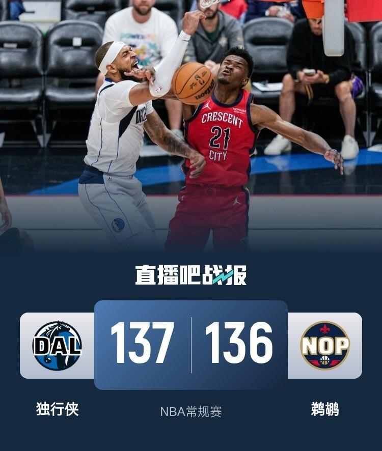 开场后锡安表现活跃上来没多久就砍下10分,在他的带领下鹈鹕抢占先机,随后欧文也开始发力帮助独行侠将比分反超。第二节上来两队依旧打得十分胶着,场上比分交替上升,半场结束前鹈鹕突然抓住转换机会掀起一波反扑,墨菲连续上演空接暴扣,鹈鹕上半场领先6分结束。下半场回来两队依旧大打对攻战,独行侠全面开花单节轰下40分夺回领先,最后一节克莱和华盛顿连续两记三分帮助独行侠将优势拉大。虽然此后鹈鹕还是努力追分,但独行侠外线三分神准总能及时回应,虽然鹈鹕最后又追到只差3分,但时间所剩不多,最终独行侠137-136送给鹈鹕4连败。
