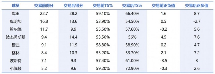 下图是勇士核心轮换成员在巴特勒交易前后的数据对比: