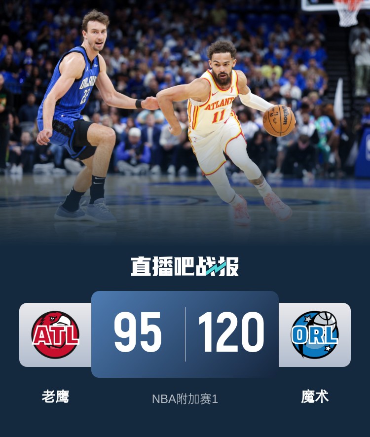 比赛开始,两队开场势均力敌,比分交替领先,老鹰突然哑火,魔术大举进攻,班凯罗频频杀伤,攻防两端表现全面,率队轰出18-2的进攻高潮确立优势,次节科尔-安东尼三分一举将分差拉开到20分,老鹰连投带罚苦苦支撑,半场战罢魔术61-47领先老鹰。易边再战,特雷-杨开启个人进攻模式,单节连投带罚独得12分一度将分差追到只剩3分,魔术多点开花稳住局势,末节魔术一波8-2扩大领先,老鹰努力追赶,魔术连续打成2+1强势回应,特雷-杨2T遭逐,魔术趁势轰出18-3一举杀死比赛。最终,魔术120-95大胜老鹰,锁定东部第七进入季后赛。