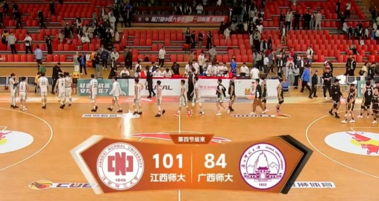 末节决战,广西师大断电且连续失误,半节仅得4分,闵定康里突外投连砍7分后丁伯儒补篮再中,熊权抢断反击再打2+0,江西师大一波16-2超级攻击波一举反超9分。广西师大连续进攻篮板但把握不住二次进攻机会,闵定康三分还中帮助江西师大重新领先双位数,最终江西师大101-84力克广西师大。