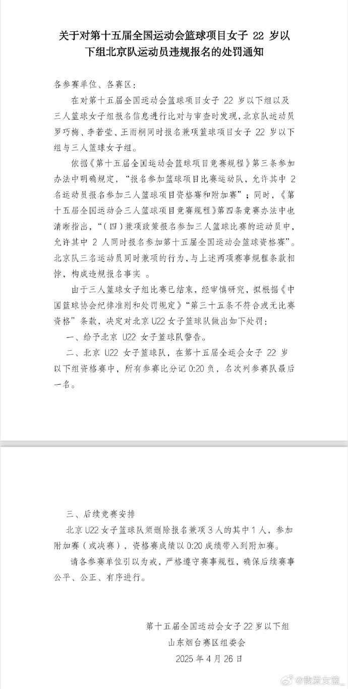 【因兼项球员超出规定人数,全运会北京U22女篮遭处罚,全部参赛场次判0:20负】