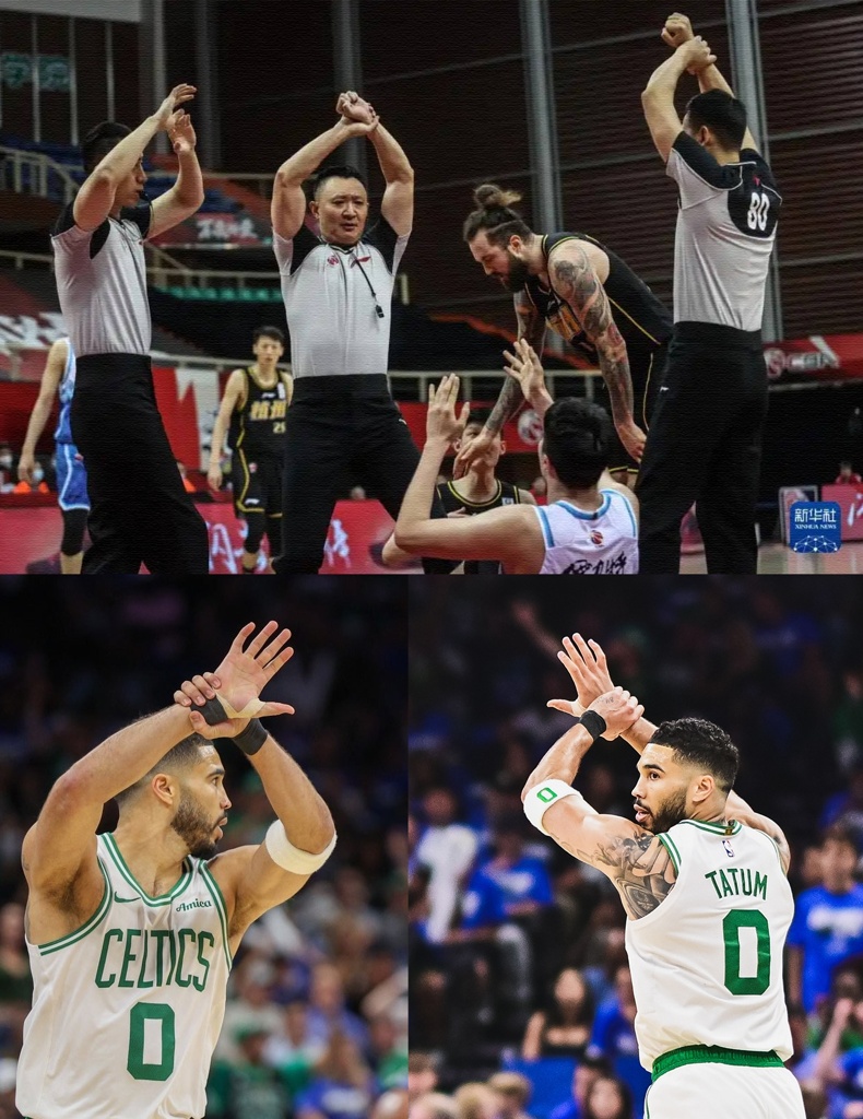 巧合的是,塔图姆的这一庆祝动作神似CBA的违体犯规动作,尤其是2021年经典的“三违一体”。