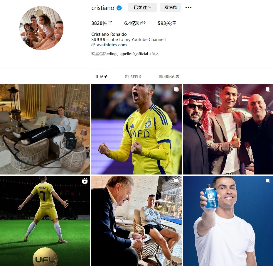而在社交媒体上,C罗更是真正的王者。2024年,C罗成为世界上关注数最高的人,各平台关注人数超过10亿,尤其是在Instagram,他有6.48亿粉丝。去年他还登陆了YouTube,他的账号UR Cristiano不到一小时就突破100万粉丝,如今已经达到7350万。