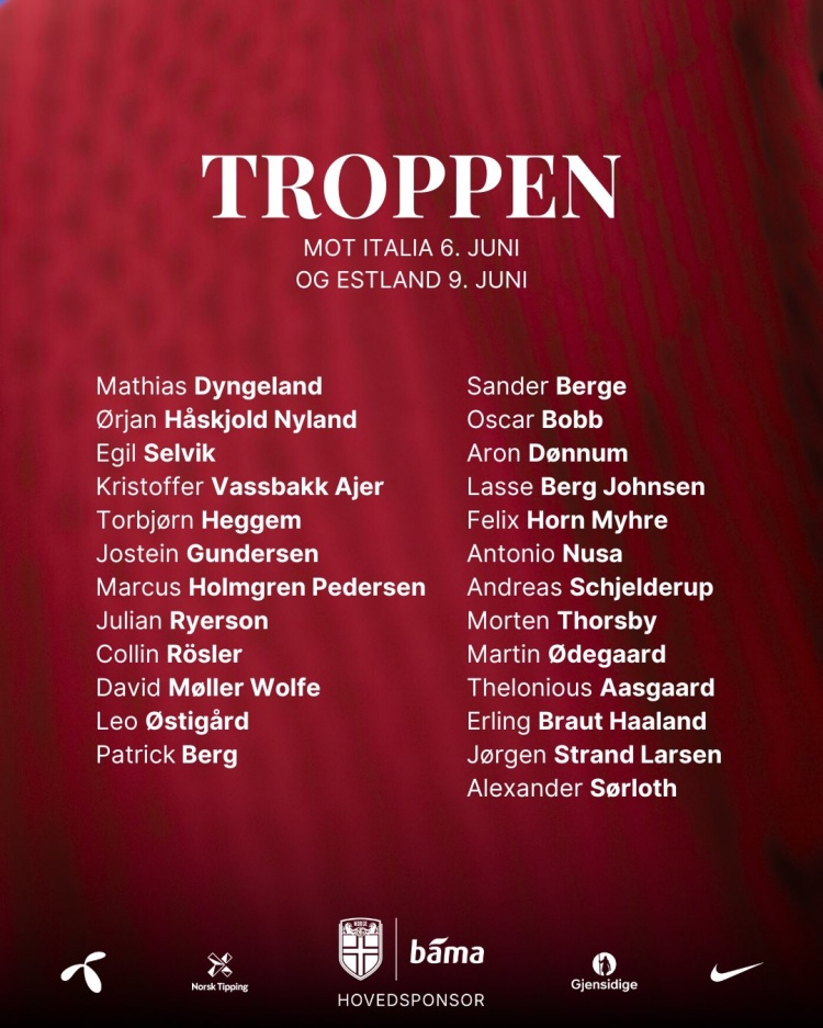 5月27日讯 挪威队官方公布了6月国际比赛日球员名单,哈兰德领衔,厄德高、索尔洛特、鲍勃在列。挪威将在6月份世预赛中对阵意大利、爱沙尼亚。