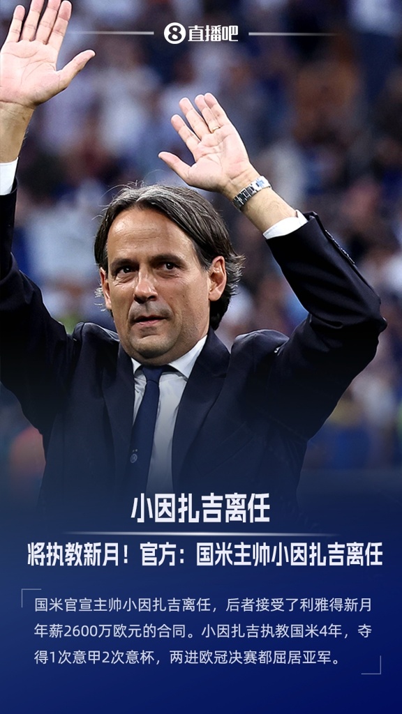 年薪2600万欧将加盟新月!国米官方:主帅小因扎吉离队