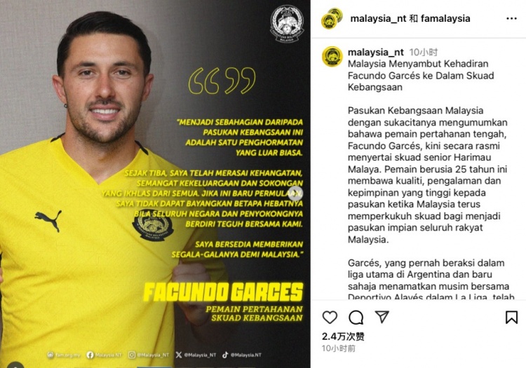 6月4日讯 近日,马来西亚足协官方宣布效力于西甲阿拉维斯的后卫法昆多-加尔塞斯完成入籍,球员的祖母是马来西亚人。加尔塞斯已经获得了代表马来西亚国家队出场的资格。