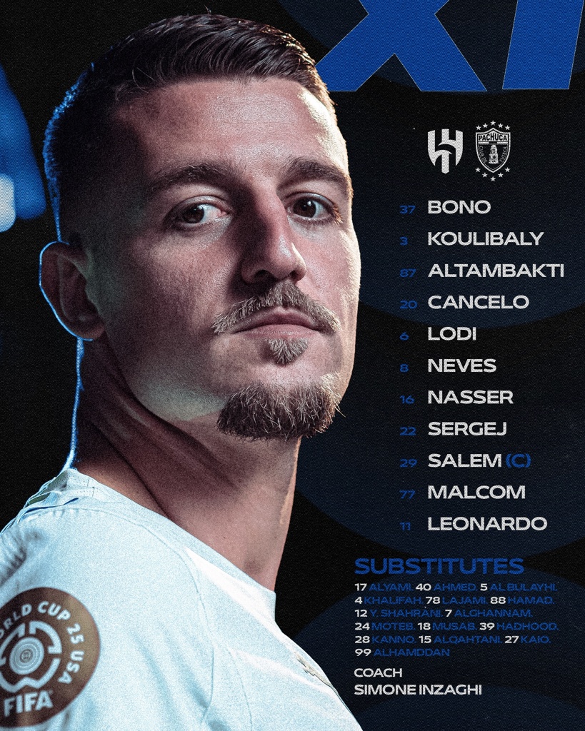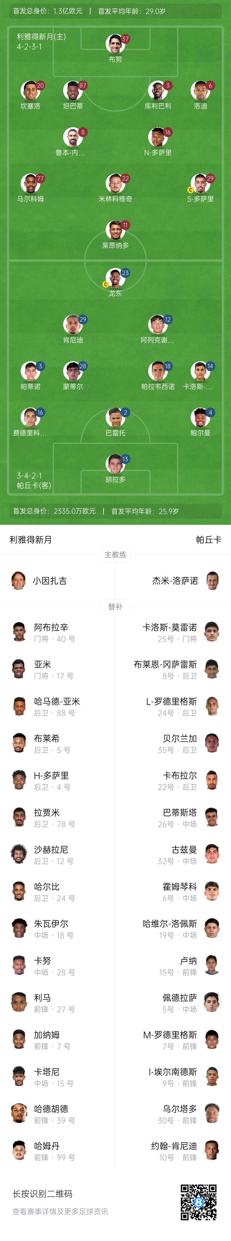 利雅得新月首发:37-布努、3-库利巴利、6-洛迪、20-坎塞洛、87-坦巴蒂、8-鲁本-内维斯、16-N-多萨里、22-米林科维奇、77-马尔科姆、11-莱昂纳多、29-S-多萨里