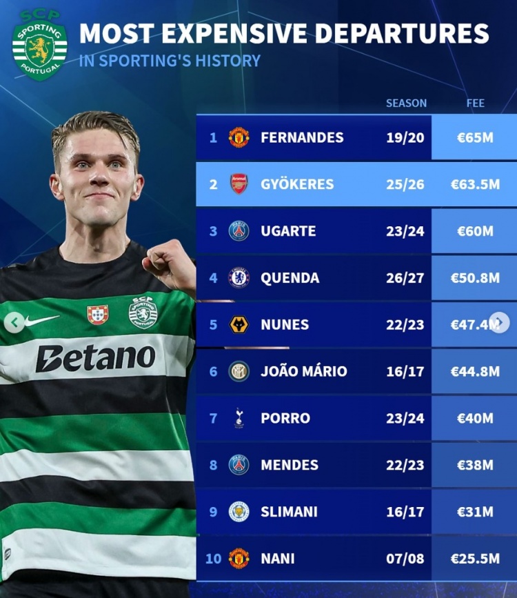 7月27日讯 阿森纳已经官宣签下瑞典中锋约克雷斯,《转会市场》也统计了葡体历史最贵卖人情况。