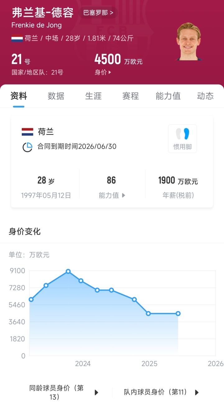 德容与巴萨的现有合同将在2026年6月30日到期,德容在2020年时与巴萨续约,并将部分薪资延期发放,以帮助俱乐部。目前德容在巴萨年薪为1900万欧元,但由于此前的薪水延期发放,巴萨原本需要在本赛季向德容支付3750万欧元的薪水。