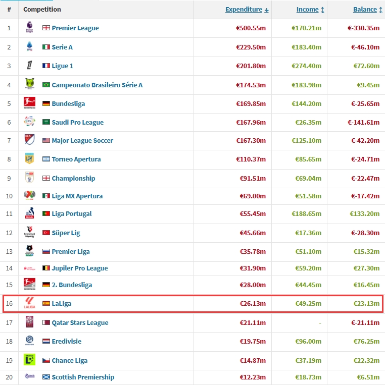 这使得西甲在此次冬窗支出排行中仅位于全球第16,甚至低于英冠、德乙等次级联赛。