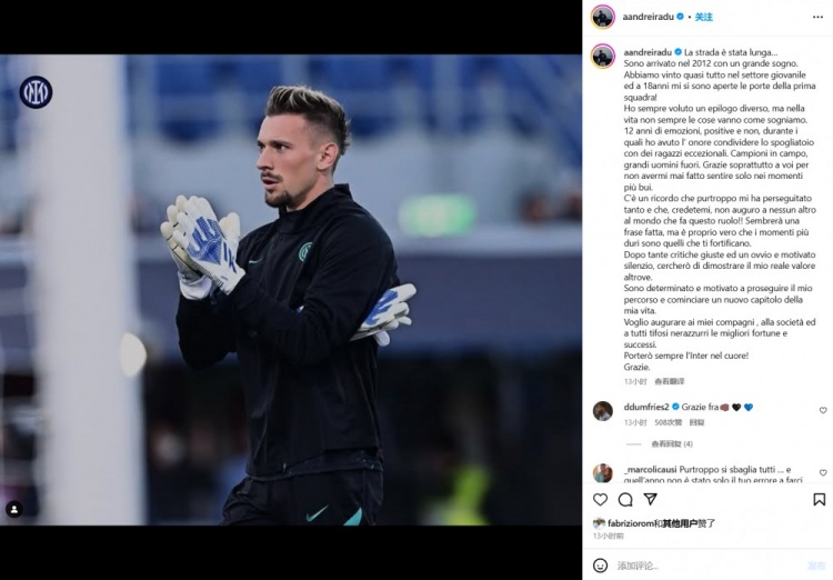 2月5日讯 门将拉杜冬窗离开国米,永久转会加盟威尼斯。在社交媒体中,拉杜长文告别了国米。