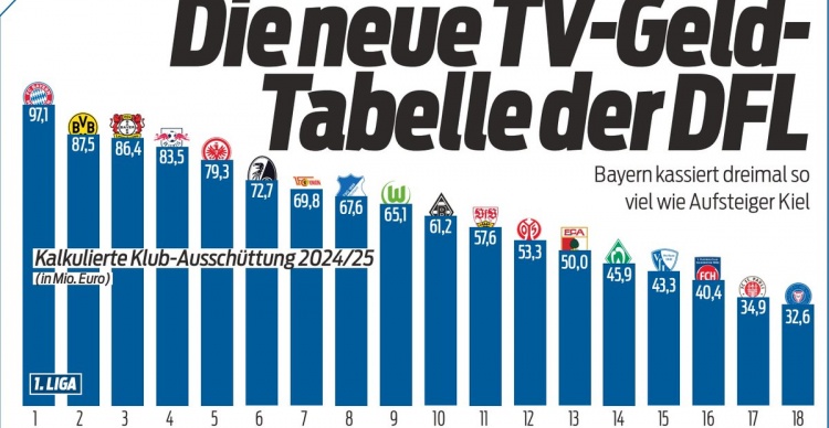 1月29日讯 德国媒体《体育图片报》统计了2024-2025赛季德甲各队的电视转播收入,并列出榜单,拜仁9710万欧元居首,多特8750万欧元次席,勒沃库森8640万欧元排名第三。